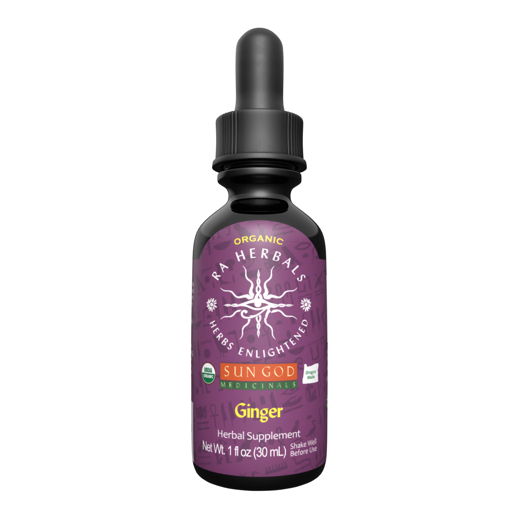 Ra Herbals Ginger Tincture (Zingiber officinale) is a certified organic single-herb extract.