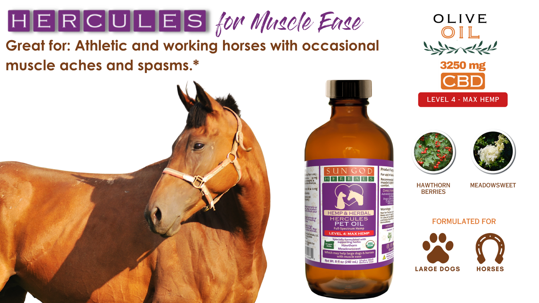 Whether your horse is training hard or your dog loves long adventures, occasional muscle stiffness and spasms can slow them down. Hercules Pet Oil is a 100% organic herbal and hemp blend formulated to support muscle ease, comfort, and recovery in working horses and large dogs.